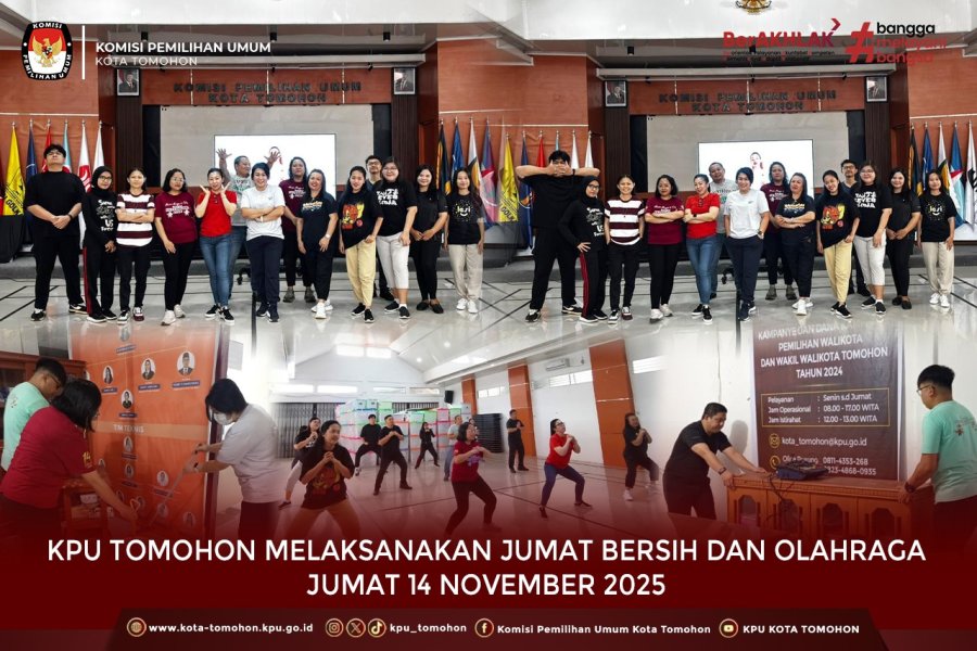 Tomohon, kota-tomohon.kpu.go.id - KPU Kota Tomohon kembali melaksanakan kegiatan rutin Jumat Bersih dan Olahraga pada hari ini, Jumat, 14 November 2025. Kegiatan ini dilakukan sebagai upaya berkelanjutan untuk menjaga lingkungan kerja yang bersih, aman, dan nyaman, sekaligus meningkatkan kebugaran serta produktivitas seluruh jajaran Sekretariat KPU Kota Tomohon.