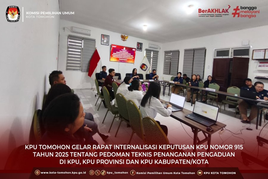 Tomohon, kota-tomohon.kpu.go.id - KPU Kota Tomohon melaksanakan Rapat Internalisasi Keputusan Komisi Pemilihan Umum Nomor 915 Tahun 2025 tentang Pedoman Teknis Sistem Penanganan Pengaduan (Whistleblowing System) di lingkungan KPU, KPU Provinsi, serta KPU Kabupaten/Kota pada Selasa, 18 November 2025, bertempat di Ruang Rapat KPU Kota Tomohon.