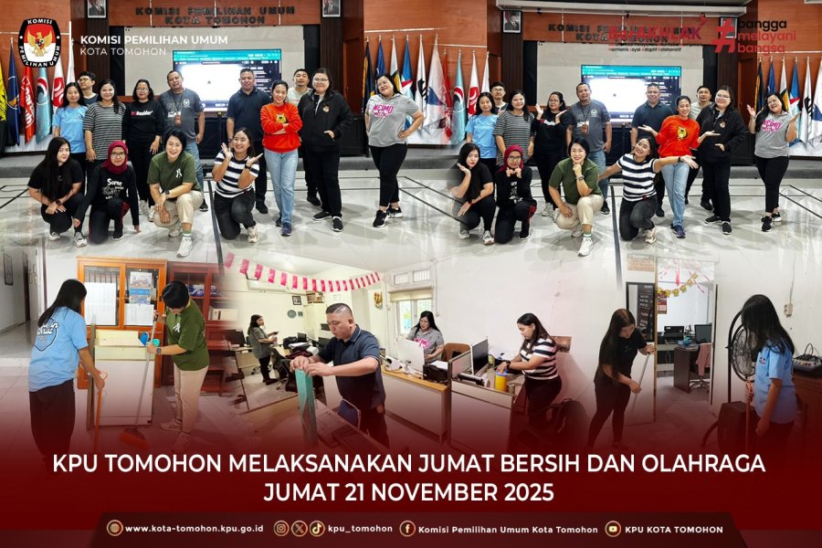 Tomohon, kota-tomohon.kpu.go.id - KPU Kota Tomohon kembali melaksanakan kegiatan rutin Jumat Bersih dan Olahraga pada hari ini, Jumat, 21 November 2025. Kegiatan ini dilakukan sebagai upaya berkelanjutan untuk menjaga lingkungan kerja yang bersih, aman, dan nyaman, sekaligus meningkatkan kebugaran serta produktivitas seluruh jajaran Sekretariat KPU Kota Tomohon.