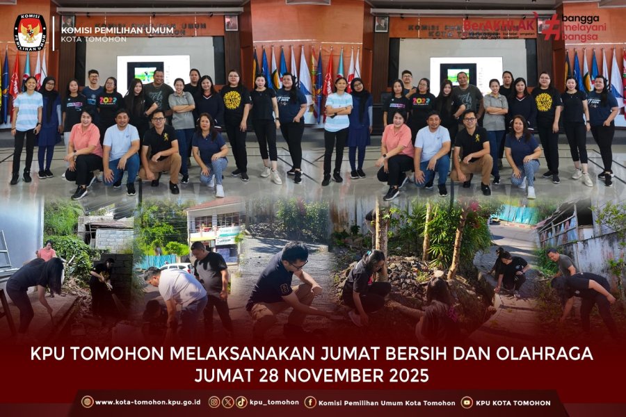 Tomohon, kota-tomohon.kpu.go.id - KPU Kota Tomohon kembali melaksanakan kegiatan rutin Jumat Bersih dan Olahraga pada hari ini, Jumat, 21 November 2025. Kegiatan ini dilakukan sebagai upaya berkelanjutan untuk menjaga lingkungan kerja yang bersih, aman, dan nyaman, sekaligus meningkatkan kebugaran serta produktivitas seluruh jajaran Sekretariat KPU Kota Tomohon.