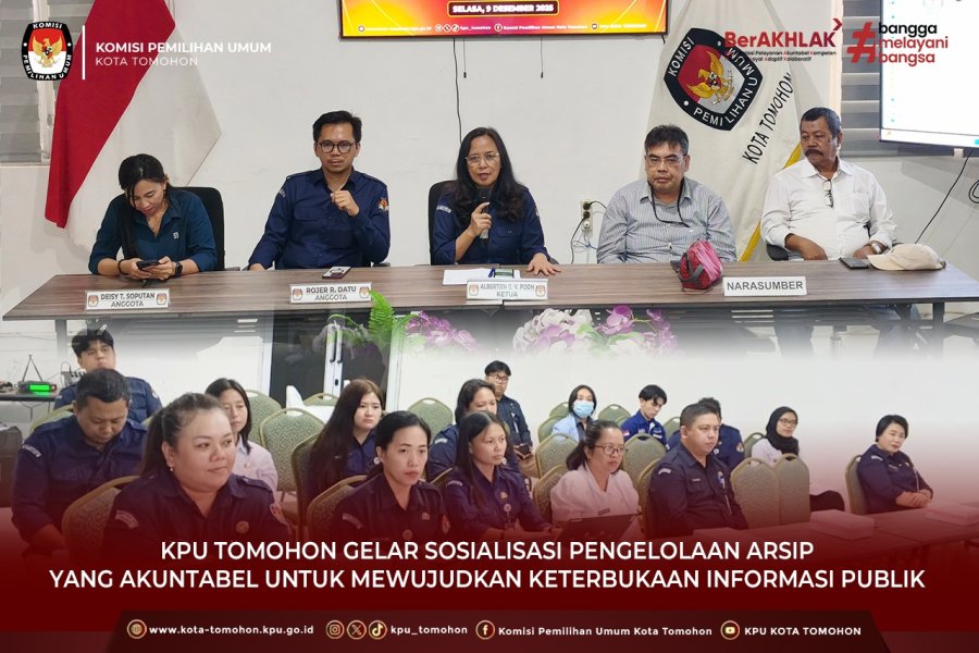 Tomohon, kota-tomohon.kpu.go.id - Komisi Pemilihan Umum (KPU) Kota Tomohon menggelar kegiatan Sosialisasi Pengelolaan Arsip yang Akuntabel untuk Mewujudkan Keterbukaan Informasi Publik dengan menghadirkan narasumber yaitu Ketua Komisi Informasi Publik (KIP) Provinsi Sulawesi Utara, Andre R. M. Mongdong didampingi oleh Wakil Ketua, Isman Momintan. Kegiatan dilaksanakan di Ruang Rapat KPU Kota Tomohon (9/12/2025).