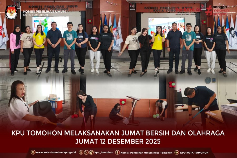 Tomohon, kota-tomohon.kpu.go.id - KPU Kota Tomohon kembali melaksanakan kegiatan rutin Jumat Bersih dan Olahraga pada hari ini, Jumat, 12 Desember 2025. Kegiatan ini dilakukan sebagai upaya berkelanjutan untuk menjaga lingkungan kerja yang bersih, aman, dan nyaman, sekaligus meningkatkan kebugaran serta produktivitas seluruh jajaran Sekretariat KPU Kota Tomohon.