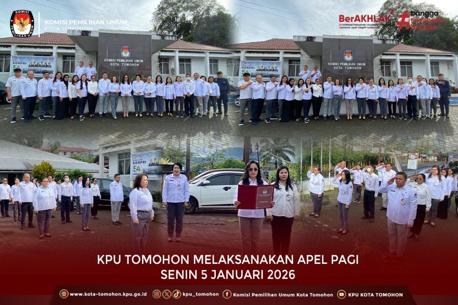 Tomohon, kota-tomohon.kpu.go.id - KPU Kota Tomohon melaksanakan Apel Pagi Rutin, Senin 5 Januari 2026 di halaman kantor KPU Kota Tomohon. Ketua KPU Kota Tomohon, Albertien G.V. Pijoh bertindak sebagai Pembina Apel. Dalam amanatnya Pijoh menyampaikan bahwa di tahun yang baru 2026 ini kita harus tetap semangat dalam menjalankan setiap tugas dan tanggung jawab yang sudah diberikan oleh pimpinan serta meningkatkan disiplin kerja pegawai.