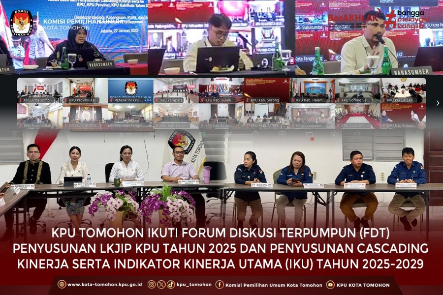 Tomohon, kota-tomohon.kpu.go.id – Komisi Pemilihan Umum (KPU) Kota Tomohon mengikuti kegiatan Forum Diskusi Terpumpun (FDT) Penyusunan Laporan Kinerja Instansi Pemerintah (LKjIP) KPU Tahun 2025 serta Penyusunan Cascading Kinerja dan Indikator Kinerja Utama (IKU) KPU, KPU Provinsi, dan KPU Kabupaten/Kota Tahun 2025–2029. Kegiatan ini dilaksanakan sebagai bagian dari upaya strategis KPU dalam memperkuat sistem perencanaan, pengukuran, dan pelaporan kinerja yang akuntabel serta selaras dengan kebijakan pembangunan nasional.