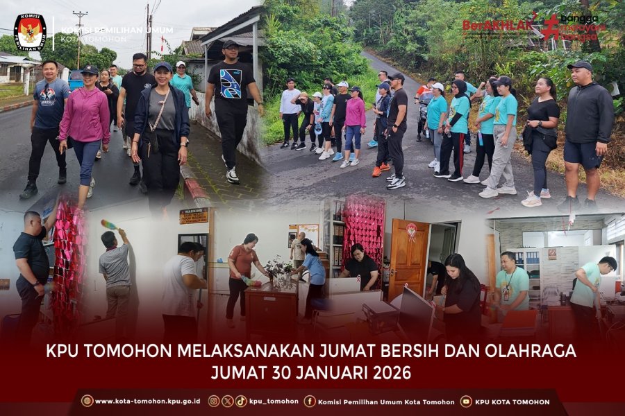 Tomohon, kota-tomohon.kpu.go.id - Dalam rangka menjaga kebersihan lingkungan kerja serta meningkatkan kebugaran dan kebersamaan, jajaran Sekretariat Komisi Pemilihan Umum (KPU) Kota Tomohon melaksanakan kegiatan Jumat Bersih dan Olahraga Bersama (30/1/2026).