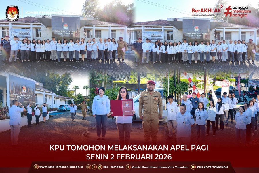 Apel Pagi diikuti oleh Komisioner, Sekretaris KPU Kota Tomohon, Kasubbag dan seluruh jajaran Sekretariat KPU Kota Tomohon. Kegiatan apel rutin ini menjadi salah satu bentuk komitmen KPU Kota Tomohon dalam membangun budaya kerja yang tertib, transparan dan akuntabel.