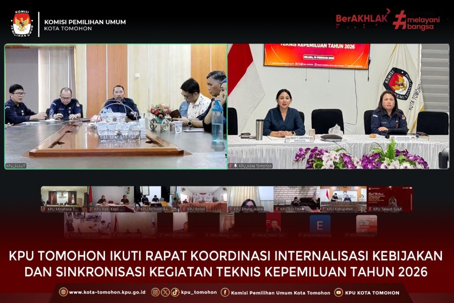 Tomohon, kota-tomohon.kpu.go.id - Komisi Pemilihan Umum (KPU) Kota Tomohon mengikuti Rapat Koordinasi (Rakor) Internalisasi Kebijakan dan Sinkronisasi Kegiatan Teknis Kepemiluan Tahun 2026 yang diselenggarakan oleh KPU Provinsi Sulawesi Utara. Kegiatan ini dilaksanakan secara hybrid pada Selasa, 10 Februari 2026, yang diikuti oleh KPU Kota Tomohon secara daring dari Ruang Rapat KPU Kota Tomohon.