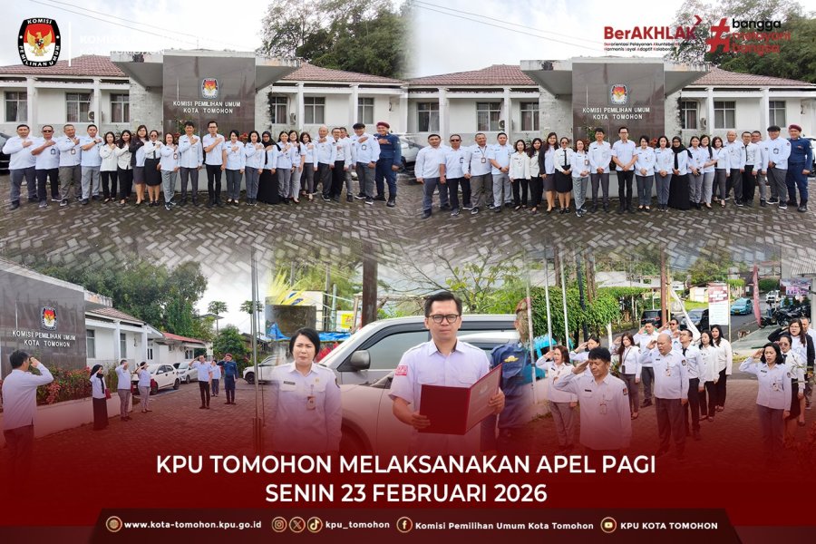 Tomohon, kota-tomohon.kpu.go.id - Komisi Pemilihan Umum (KPU) Kota Tomohon melaksanakan apel pagi rutin bertempat di Halaman Kantor KPU Kota Tomohon (23/2/2026). Kegiatan apel pagi dilaksanakan sebagai bentuk kedisiplinan dan penguatan koordinasi di lingkungan kerja.