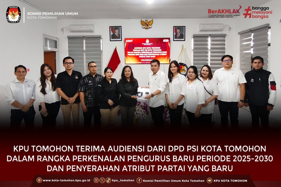 Tomohon, kota-tomohon.kpu.go.id - Komisi Pemilihan Umum Kota Tomohon menerima audiensi Dewan Pimpinan Daerah Partai Solidaritas Indonesia Kota Tomohon dalam rangka perkenalan pengurus baru periode 2025–2030 serta penyerahan dokumen dan atribut partai. Kegiatan dilaksanakan di Ruang Rapat Kantor KPU Kota Tomohon, pada Rabu, 25 Februari 2026.