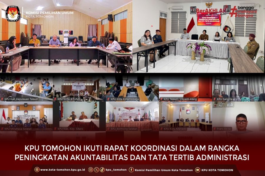 Tomohon, kota -tomohon.kpu.go.id - Komisi Pemilihan Umum (KPU) Kota Tomohon menghadiri rapat Koordinasi dengan KPU Provinsi dan KPU Kabupaten/Kota se_Sulawesi Utara Kamis 5 Maret 2026 secara daring melalui Zoom Meeting. Adapun maksud dari rapat Koordinasi untuk Peningkatan Akuntabilitas dan Tata Tertib Administrasi pada KPU Kabupaten/Kota.