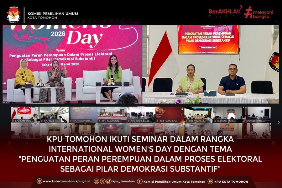 Tomohon, kota-tomohon.kpu.go.id - Komisi Pemilihan Umum (KPU) Kota Tomohon mengikuti seminar dalam rangka peringatan International Women’s Day yang diselenggarakan oleh Komisi Pemilihan Umum Republik Indonesia (KPU RI) pada Kamis (12/3/2026) dengan tema “Penguatan Peran Perempuan dalam Proses Elektoral sebagai Pilar Demokrasi Substantif.”