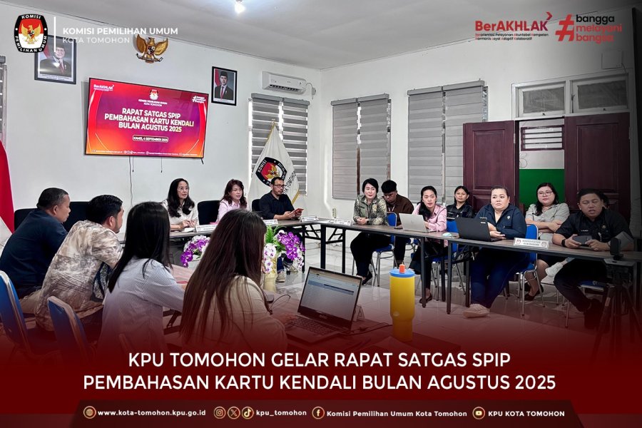Tomohon, kota-tomohon.kpu.go.id - Komisi Pemilihan Umum (KPU) Kota Tomohon menggelar rapat rutin Satuan Tugas Sistem Pengendalian Intern Pemerintah (Satgas SPIP) pada Kamis, 4 September 2025, bertempat di Ruang Rapat KPU Kota Tomohon.