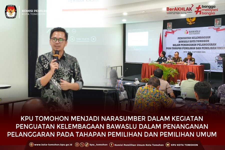Tomohon, kota-tomohon.kpu.go.id - KPU Tomohon menjadi Narasumber dalam kegiatan Penguatan Kelembagaan Bawaslu dengan tema Penguatan Kelembagaan Bawaslu Kota Tomohon dalam Penanganan Pelanggaran pada Tahapan Pemilihan dan Pemilihan Umum, bertempat di Wise Hotel Tomohon, 9 September 2025.