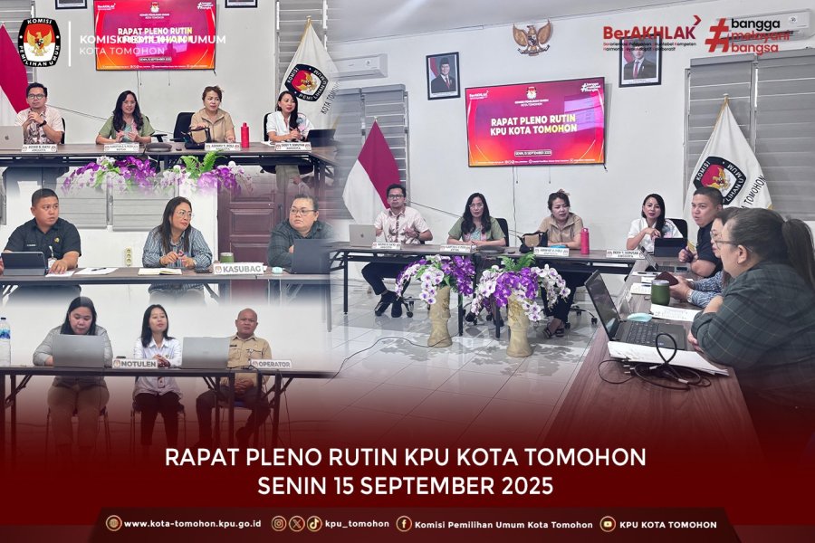 Tomohon, kota-tomohon.kpu.go.id - KPU Kota Tomohon melaksanakan Rapat Pleno Rutin pada Senin 15 September 2025, bertempat di Ruang Rapat KPU Kota Tomohon. Rapat ini dihadiri oleh Komisioner, Sekretaris dan para Kepala Sub Bagian KPU Kota Tomohon.