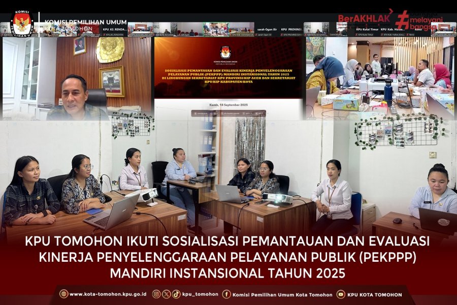 Tomohon, kota-tomohon.kpu.go.id - Komisi Pemilihan Umum (KPU) Kota Tomohon mengikuti sosialisasi pelaksanaan Pemantauan dan Evaluasi Kinerja Penyelenggaraan Pelayanan Publik (PEKPPP) Mandiri Instansional KPU Tahun 2025 pada Kamis, 18 September 2025. Kegiatan ini dilaksanakan secara daring melalui Zoom Meeting.