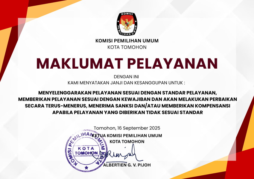 Segenap jajaran KPU Kota Tomohon, berkomitmen untuk memberikan pelayanan terbaik kepada masyarakat secara profesional, jujur, transparan, dan akuntabel. Pelayanan cepat, tepat, serta bebas dari pungutan liar adalah hak setiap masyarakat.