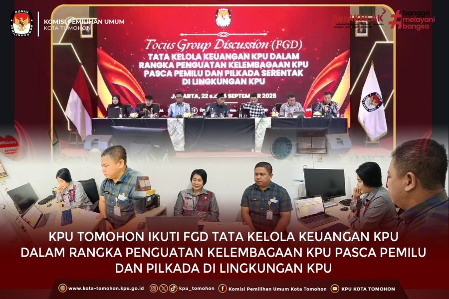 KPU Kota Tomohon menghadiri Forum Group Discussion (FGD) Tata Kelola Keuangan KPU dalam rangka Penguatan Kelembagaan Pasca Pemilu dan Pilkada. Kegiatan ini berlangsung secara daring pada 22–24 September 2025 dari Ruang Rapat KPU Kota Tomohon, dengan pelaksanaan secara hybrid oleh KPU RI.
