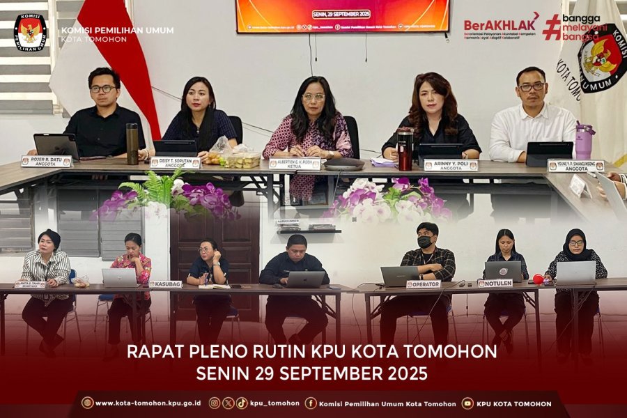 Tomohon, kota-tomohon.kpu.go.id - KPU Kota Tomohon melaksanakan Rapat Pleno Rutin pada Senin 29 September 2025, bertempat di Aula KPU Kota Tomohon. Rapat ini dihadiri oleh Komisioner, Sekretaris dan para Kepala Sub Bagian KPU Kota Tomohon.