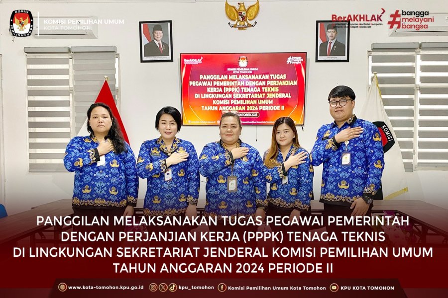 Tomohon, kota-tomohon.kpu.go.id - Menindaklanjuti Pengumuman Sekretaris Jenderal Komisi Pemilihan Umum Republik Indonesia Nomor 154/SDM.02.1-Pu/04/2025, KPU Kota Tomohon melaksanakan Panggilan melaksanakan Tugas sebagai Pegawai Pemerintah dengan Perjanjian Kerja (PPPK) Tenaga Teknis di Lingkungan Sekretariat Jenderal Komisi Pemilihan Umum Tahun Anggaran 2024 Periode II, pada Rabu 1 Oktober 2025.