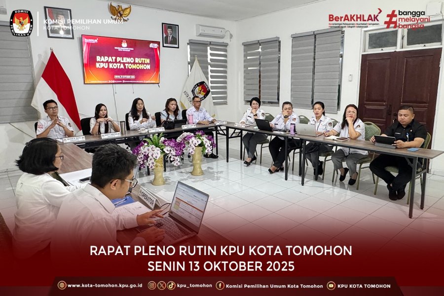 Tomohon, kota-tomohon.kpu.go.id - KPU Kota Tomohon melaksanakan Rapat Pleno Rutin pada Senin 13 Oktober 2025, bertempat di Aula KPU Kota Tomohon. Rapat ini dihadiri oleh Komisioner, Sekretaris dan para Kepala Sub Bagian KPU Kota Tomohon.