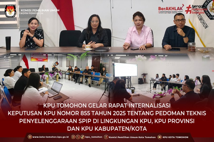Tomohon, kota-tomohon.kpu.go.id - KPU Kota Tomohon menggelar Rapat Internalisasi Keputusan Komisi Pemilihan Umum Nomor 855 Tahun 2025 tentang Pedoman Teknis Penyelenggaraan Sistem Pengendalian Intern Pemerintah (SPIP) di Komisi Pemilihan Umum, Komisi Pemilihan Umum Provinsi, dan Komisi Pemilihan Umum Kabupaten/Kota. Kegiatan ini berlangsung di Ruang Rapat KPU Kota Tomohon.
