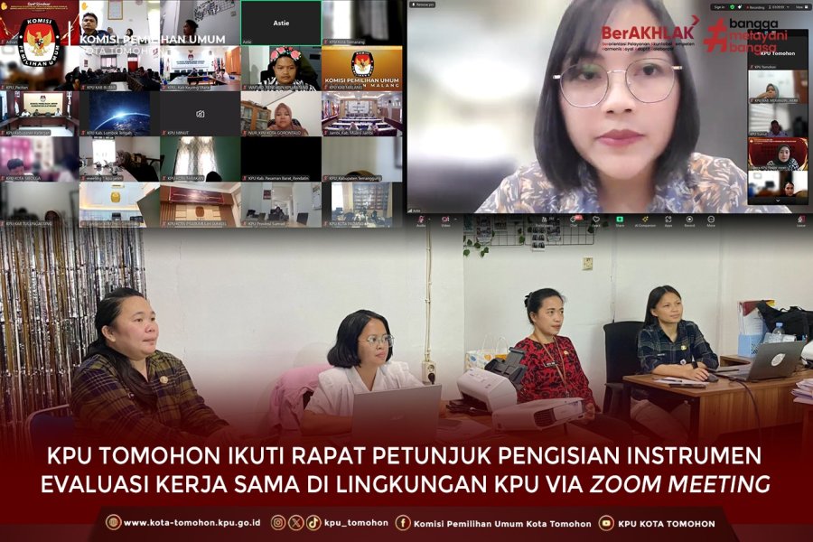 Tomohon, kota-tomohon.kpu.go.id - Komisi Pemilihan Umum (KPU) Kota Tomohon mengikuti Rapat Petunjuk Pengisian Instrumen Evaluasi Kerja Sama di Lingkungan KPU, KPU Provinsi/KIP Aceh, dan KPU/KIP Kabupaten/Kota yang diselenggarakan oleh Komisi Pemilihan Umum Republik Indonesia secara daring melalui aplikasi Zoom Meeting.