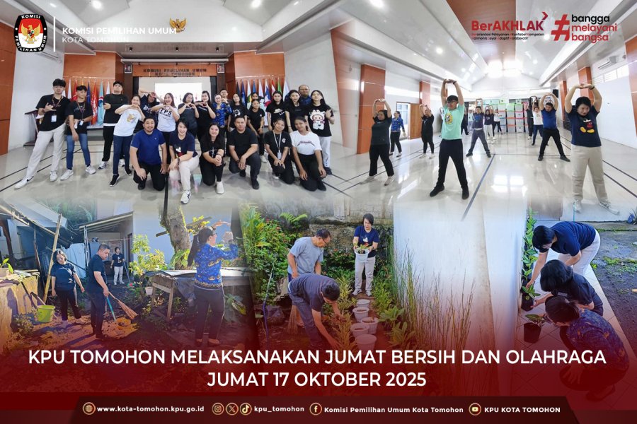Tomohon, kota-tomohon.kpu.go.id - KPU Kota Tomohon kembali melaksanakan kegiatan rutin Jumat Bersih dan Olahraga pada hari ini, Jumat, 17 Oktober 2025. Kegiatan ini dilakukan sebagai upaya berkelanjutan untuk menjaga lingkungan kerja yang bersih, aman, dan nyaman, sekaligus meningkatkan kebugaran serta produktivitas seluruh jajaran Sekretariat KPU Kota Tomohon.