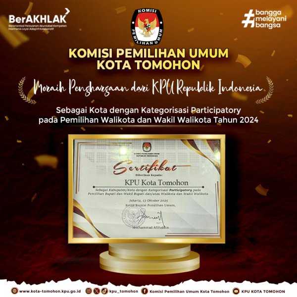 Penghargaan ini sebagai bentuk apresiasi dari KPU Republik Indonesia atas tingginya partisipasi dan keterlibatan aktif masyarakat dalam setiap tahapan Pilkada 2024 sekaligus menjadi bukti nyata kerja keras seluruh jajaran serta masyarakat Kota Tomohon yang terus berkomitmen membangun budaya demokrasi partisipatif.