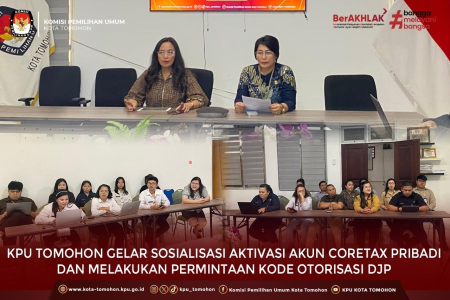Tomohon, kota-tomohon.kpu.go.id - Komisi Pemilihan Umum (KPU) Kota Tomohon melaksanakan kegiatan aktivasi akun Coretax pribadi serta permintaan Kode Otorisasi DJP secara luring pada Kamis, 23 Oktober 2025, pukul 10.00–11.00 WITA, bertempat di Ruang Rapat KPU Kota Tomohon. Kegiatan ini merupakan tindak lanjut atas surat dari Kantor Pelayanan Pajak (KPP) Pratama Manado Nomor: S-1010/KPP.1601/2025 tanggal 6 Oktober 2025 perihal Imbauan Aktivasi Akun Coretax Orang Pribadi dan Kode Otorisasi DJP bagi ASN.
