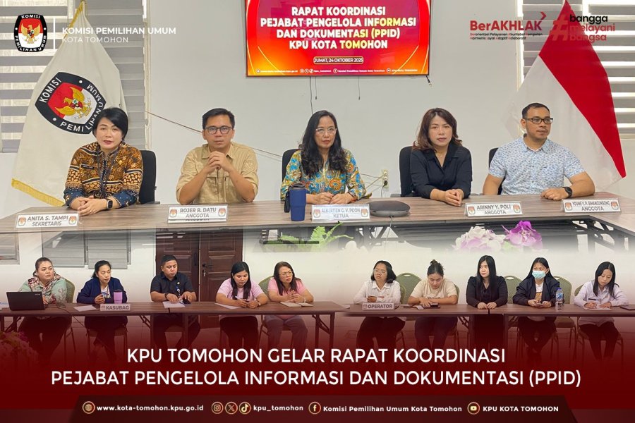 Tomohon, kota-tomohon.kpu.go.id - Komisi Pemilihan Umum (KPU) Kota Tomohon melaksanakan Rapat Koordinasi Pejabat Pengelola Informasi dan Dokumentasi (PPID) bertempat di Ruang Rapat KPU Kota Tomohon pada Jumat, 24 Oktober 2025.
