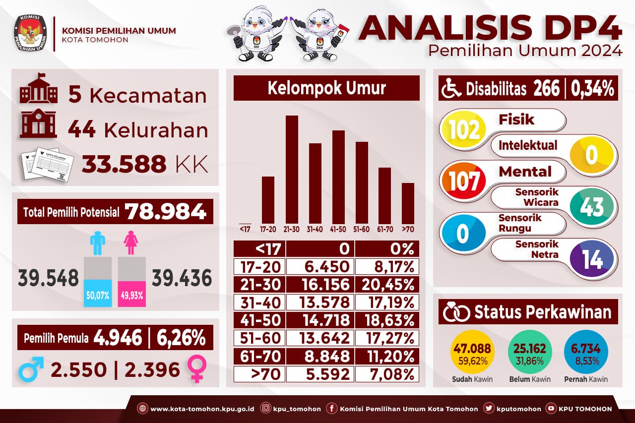 Berikut merupakan Demografi Analisis Data DP4 Pemilu Tahun 2024 Kota Tomohon