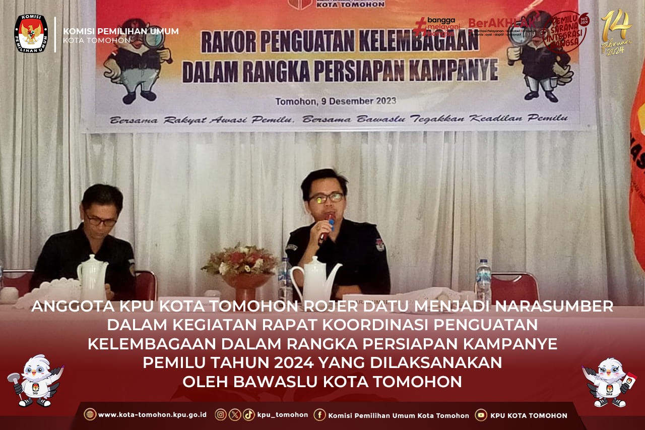 Tomohon, kota-tomohon.kpu.go.id - Ketua Divisi Sosialisasi, Pendidikan Pemilih, Partisipasi Masyarakat dan SDM KPU Kota Tomohon Rojer R. Datu menjadi Narasumber dalam Rapat Koordinasi Penguatan Kelembagaan Dalam Rangka Persiapan Kampanye Pemilu 2024 yang dilaksanakan oleh Bawaslu Kota Tomohon, bertempat di Rogs Cafe Tomohon, Sabtu 09/12.