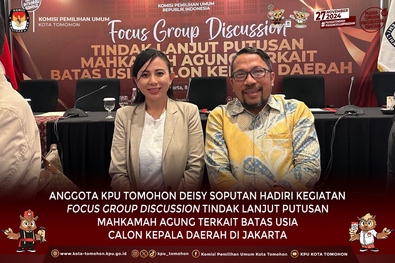 Tomohon, kota-tomohon.kpu.go.id - Anggota KPU Tomohon Deisy T. Soputan menghadiri Focus Group Discussion (FGD) Tindak Lanjut Putusan Mahkamah Agung Terkait Batas Usia Calon Kepala Daerah, di Grand Melia Hotel Jakarta, Senin (08/07/2024).