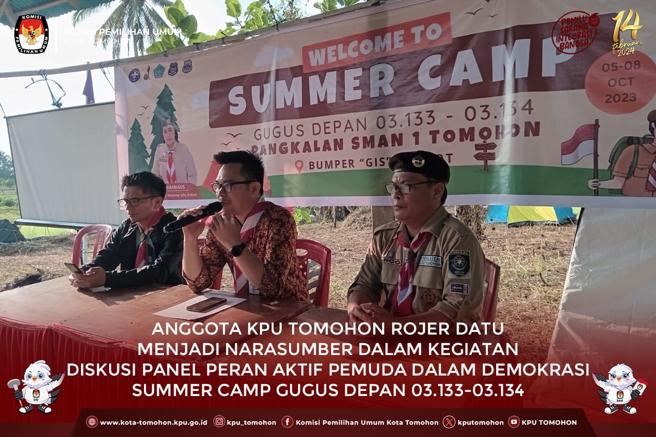 Tomohon, kota-tomohon.kpu.go.id - Ketua Divisi Sosdikli, Parmas dan SDM KPU Kota Tomohon Rojer R. Datu menjadi Narasumber terkait Tahapan dan Jadwal Penyelenggaran Pemilu 2024 serta Pendidikan Pemilih dalam Kegiatan Diskusi Panel Peran Aktif Pemuda dalam Demokrasi, Summer Camp Gugus Depan 03.133-03-134 Pangkalan SMAN 1 Tomohon, dilaksanakan di Bumper GIS Lansot, Jumat 06/10.