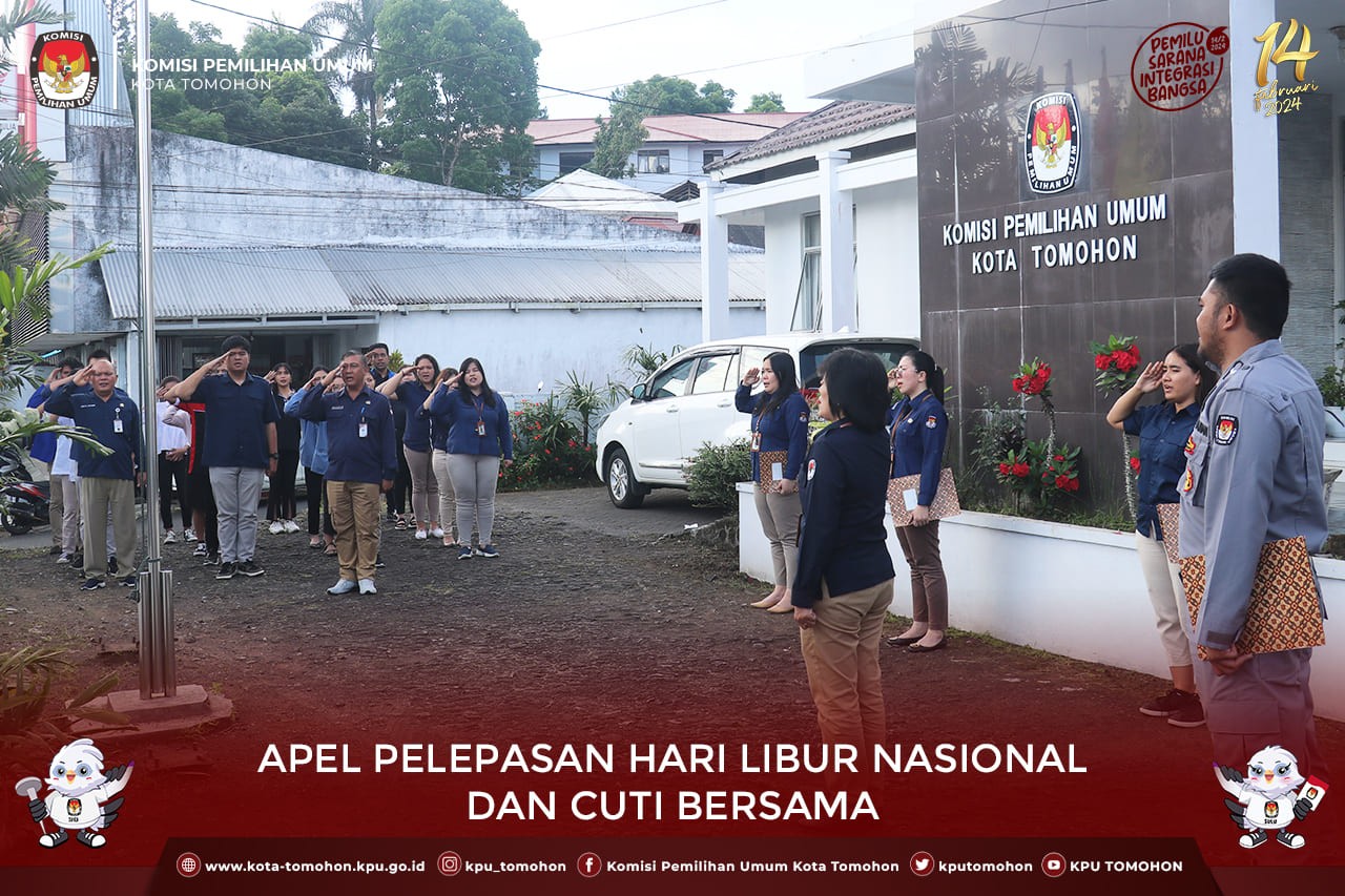 Tomohon, kota-tomohon.kpu.go.id - Komisi Pemilihan Umum Kota Tomohon menggelar Apel Pelepasan Cuti dalam rangka pelaksanaan Hari Libur dan Cuti Bersama Lebaran Tahun 2023, Selasa (18/4).