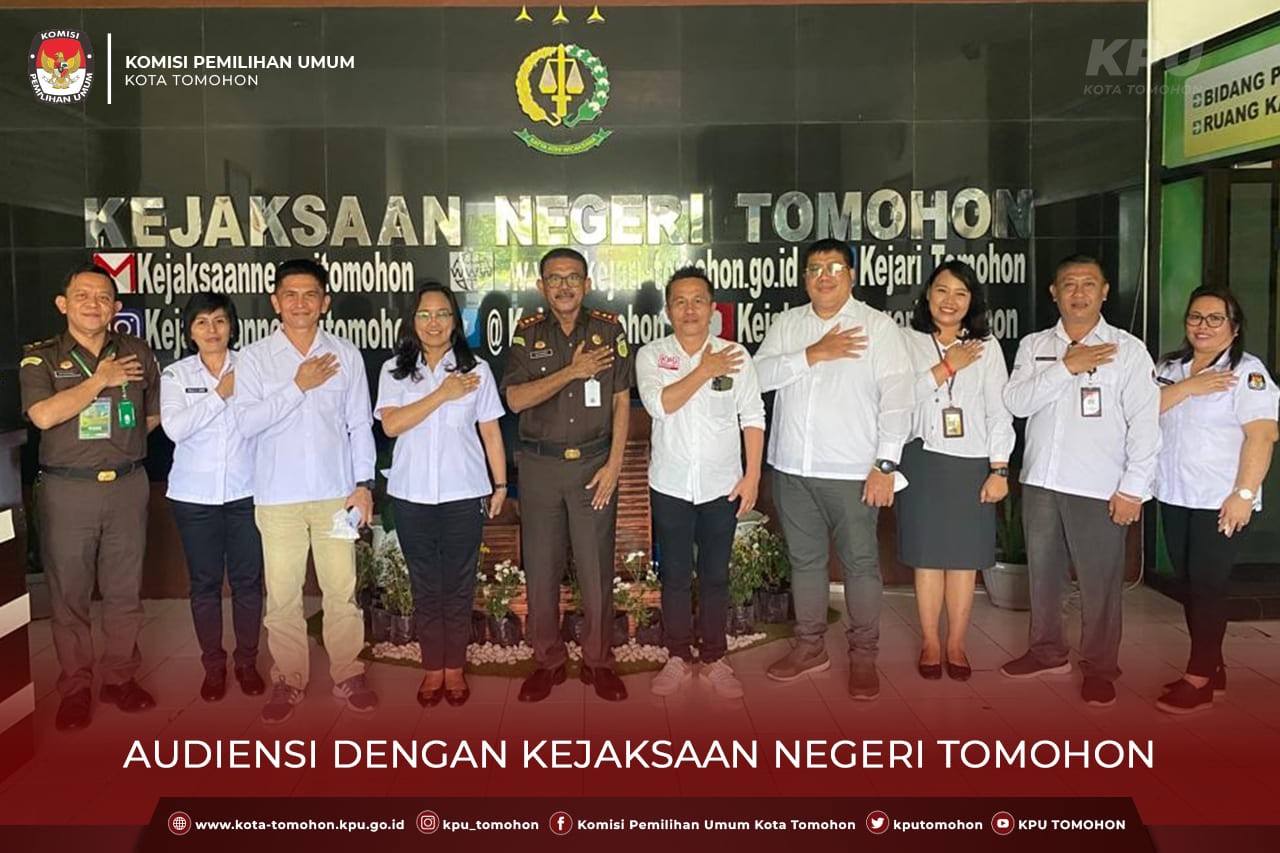 Tomohon, kota-tomohon.kpu.go.id - Ketua Harryanto Lasut bersama Anggota Stenly Kowaas, Jacobus Wowor, Albertien Pijoh, Sekretaris Stella Sompe dan Jajaran Sekretariat KPU Kota Tomohon mengadakan audensi dengan Kejaksaan Negeri Kota Tomohon yang diterima langsung oleh Kepala Kejaksaan Negeri Kota Tomohon Alfonsius Gebhard Loe Mau, SH., MH diruang kerjanya didampingi oleh Kepala Seksi Perdata dan Tata Usaha Negara Natalia Jeniffer Pingkan Runkat, SH, Senin (26/9).