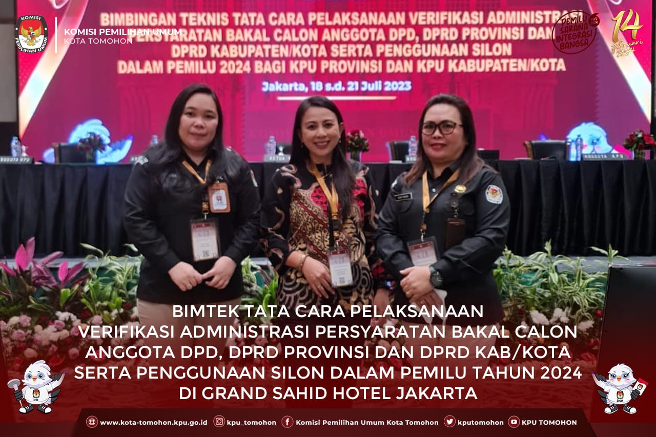 Tomohon, kota-tomohon.kpu.go.id - Bimbingan Teknis Tata Cara Pelaksanaan Verifikasi Administrasi Persyaratan Bakal Calon Anggota DPD, DPRD Provinsi dan DPRD Kabupaten/Kota serta Penggunaan Silon dalam Pemilu 2024 bagi KPU Provinsi dan KPU Kabupaten/Kota Gelombang II di Grand Sahid Hotel Jakarta 19 s.d 21 Juli 2023 diikuti oleh Kadiv Teknis Penyelenggaraan, Kasubag Teknis dan Hupmas dan Operator Silon.