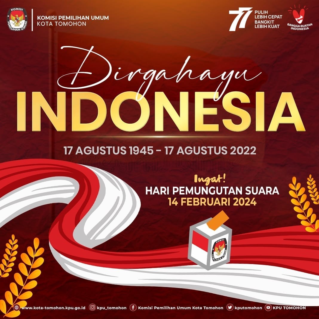 Keluarga Besar Komisi Pemilihan Umum Kota Tomohon mengucapkan Dirgahayu Republik Indonesia ke-77. Pulih Lebih Cepat, Bangkit Lebih Kuat!