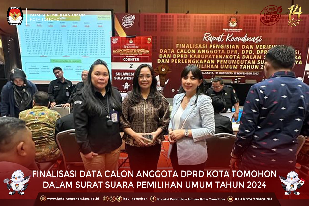 Tomohon, kota-tomohon.kpu.go.id - Ketua KPU Kota Tomohon Albertien G. V. Pijoh, Ketua Divisi Teknis Penyelenggaraan Deisy T. Soputan dan Operator Maya L. V. Longdong melakukan Finalisasi Data Calon Anggota DPRD Kota Tomohon dalam Surat Suara Pemilihan Umum Tahun 2024 dan perlengkapan pemungutan suara lainnya, di Hotel Grand Mercure Jakarta Pusat, Minggu (05/11/2023.