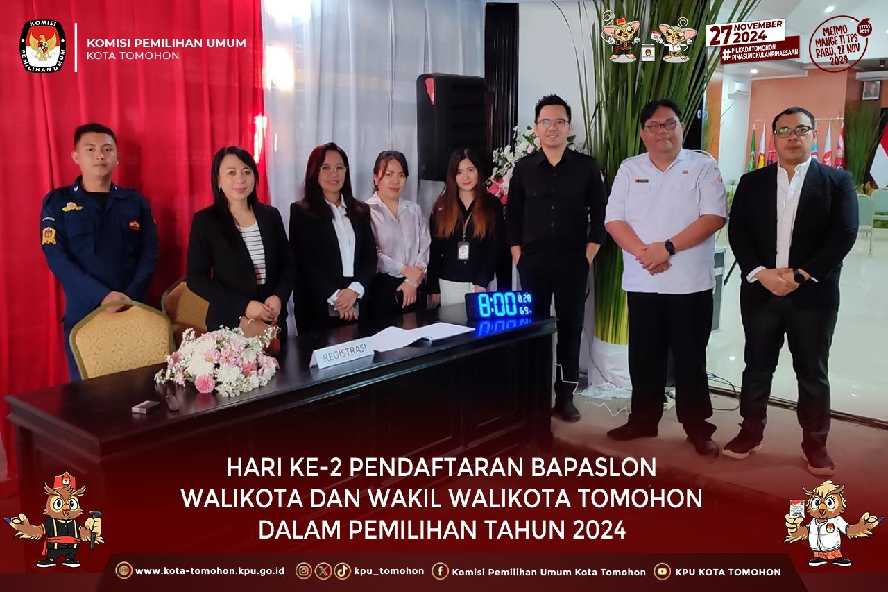 Tomohon, kota-tomohon.kpu.go.id - Tahapan Pendaftaran Bakal Pasangan Calon Walikota dan Wakil Walikota Tomohon Dalam Pemilihan Tahun 2024 di Kantor KPU Kota Tomohon Hari kedua, Rabu (28/8/2024) ditutup.