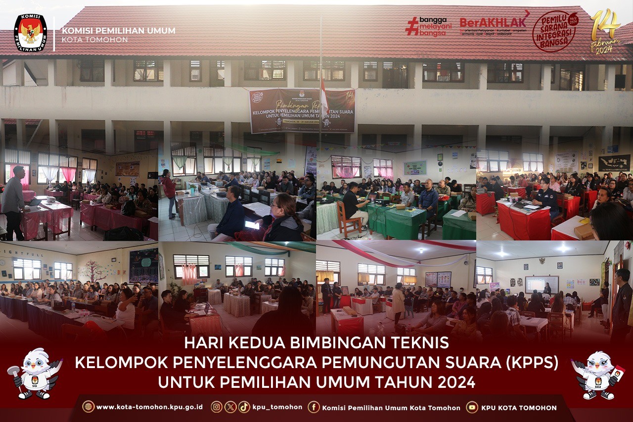 Hari Kedua, Sabtu (27/01/2024), bertempat di SMP Negeri 1 Tomohon, Pelaksanaan Bimbingan Teknis kepada Kelompok Penyelenggara Pemungutan Suara (KPPS) yang terbagi menjadi 2 sesi. Sesi I diikuti oleh KPPS se-Kecamatan Tomohon Utara dan Sesi II diikuti oleh KPPS se-Kecamatan Tomohon Tengah. Materi dibawakan langsung oleh PPS di masing-masing kelurahan didampingi oleh PPK Kecamatan Tomohon Utara dan Tomohon Tengah serta Komisi Pemilihan Umum Kota Tomohon.