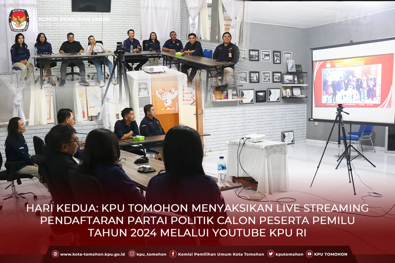 Tomohon, kota-tomohon.kpu.go.id - Selasa, (2/8) merupakan hari kedua dimana KPU Kota Tomohon menyaksikan Live Streaming Pendaftaran Partai Politik Peserta Pemilu Tahun 2024. Partai yang mendaftar dihari kedua yakni Partai Kebangkitan Nusantara (PKN). Pendaftaran dilakukan oleh Ketua Umum Gede Pasek Suardika, didampingi Sekjen Sri Mulyono, dan Bendahara Umum Mirwan Amir.