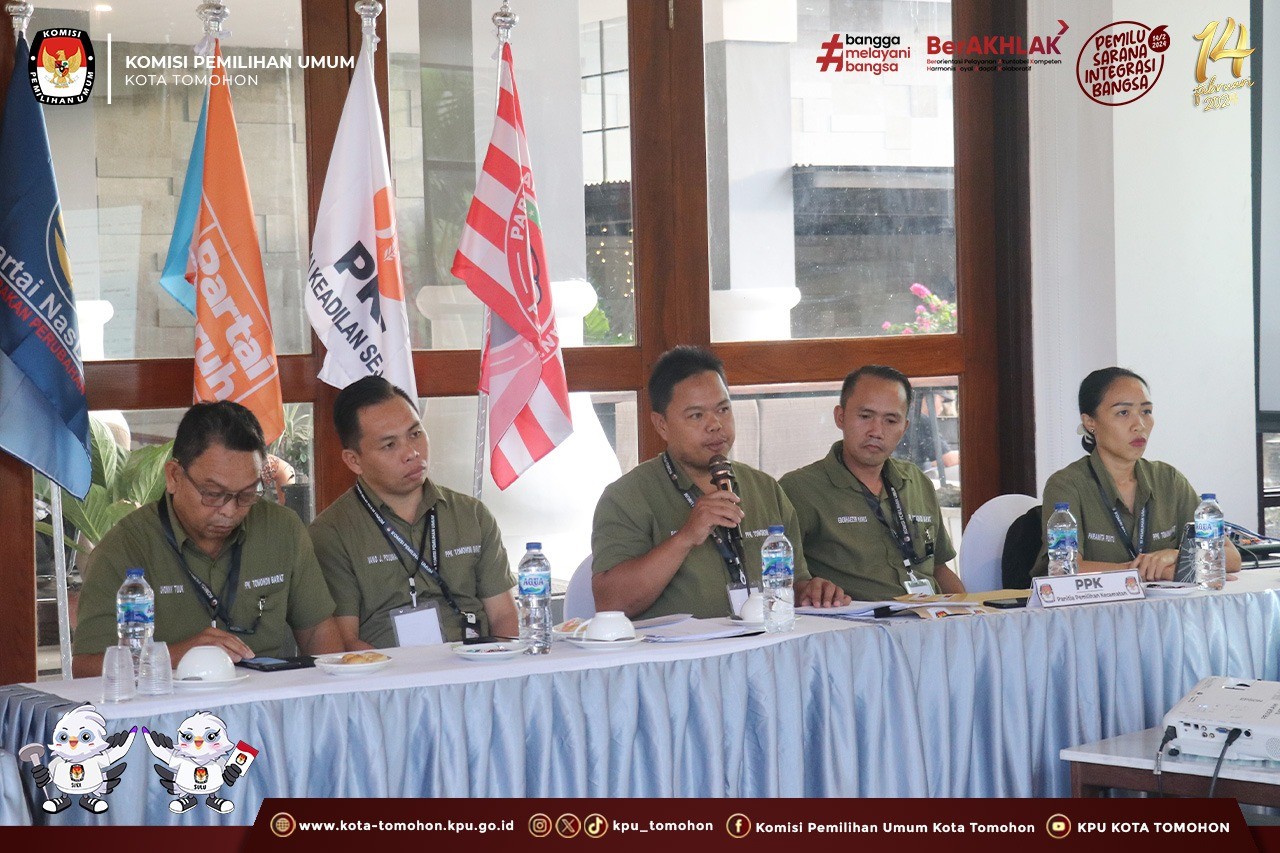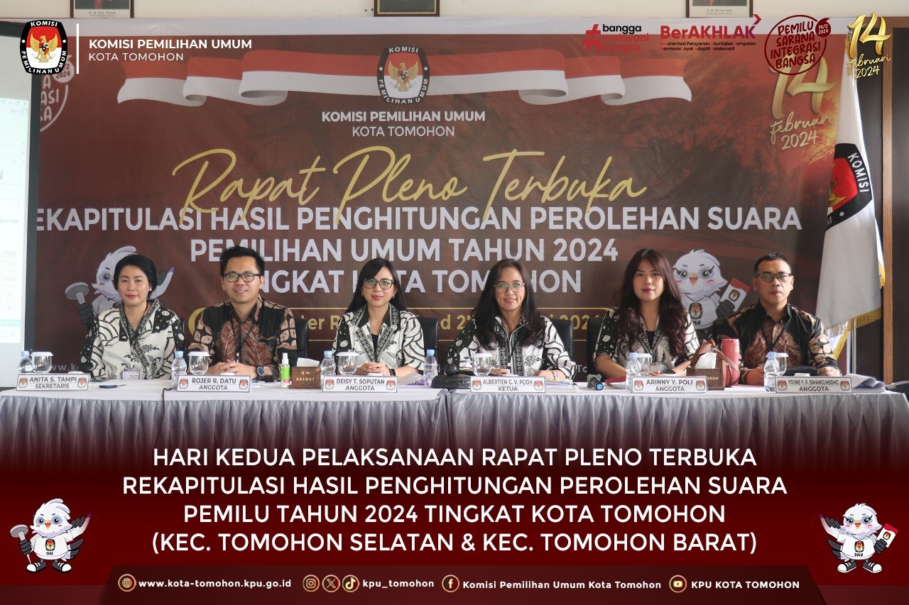 Tomohon, kota-tomohon.kpu.go.id - Hari Kedua Minggu (25/02/2024), KPU Kota Tomohon melaksanakan Rapat Pleno Terbuka Rekapitulasi Hasil Penghitungan Perolehan Suara Pemilihan Umum Tahun 2024 tingkat Kota Tomohon, bertempat di Grand Master Resort Tomohon. Kecamatan yang menyampaikan hasil rekapitulasi di hari kedua yaitu Kecamatan Tomohon Selatan dan Kecamatan Tomohon Barat.