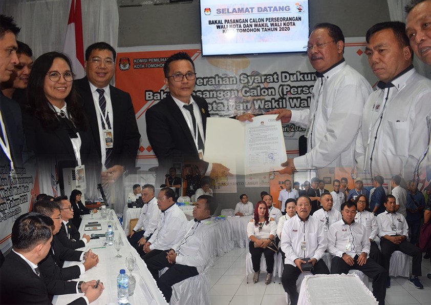 Komisi Pemilihan Umum (KPU) Kota Tomohon menerima berkas dokumen syarat dukungan bakal pasangan calon perseorangan Wali Kota dan Wakil Wali Kota Tomohon tahun 2020, Sabtu (22/02/2020). Bakal Pasangan Calon perseorangan yang memasukkan syarat dukungan yaitu Robert P. A Pelealu, SH dan Franciscus Hermanus Angelo Soekirno.