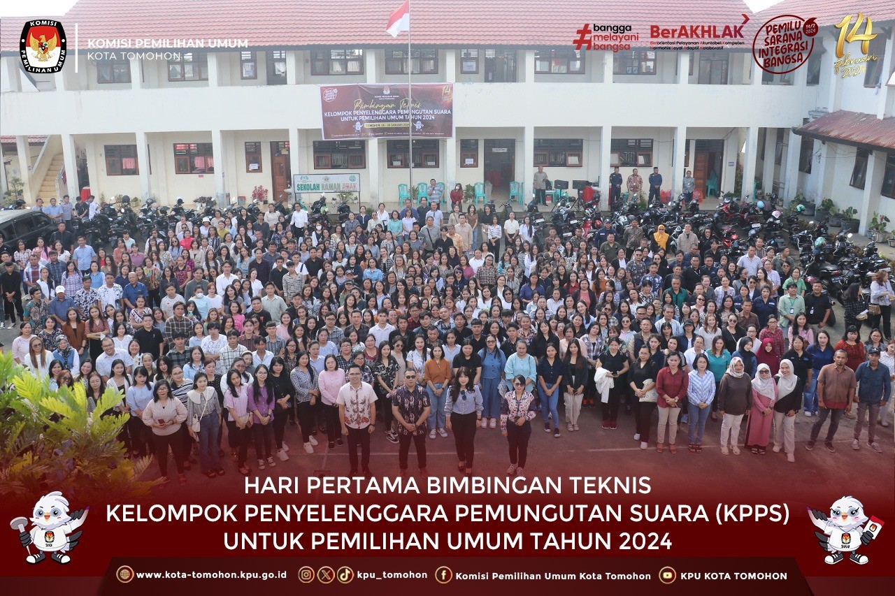 Hari Pertama, Jumat (26/01/2024), bertempat di SMP Negeri 1 Tomohon, Pelaksanaan Bimbingan Teknis kepada Kelompok Penyelenggara Pemungutan Suara (KPPS) se-Kecamatan Tomohon Selatan. Kegiatan Bimtek diawali dengan Pembukaan oleh Ketua Divisi Sosialisasi, Pendidikan Pemilih, Partisipasi Masyarakat dan SDM Rojer R. Datu didampingi Anggota Youne Y. P. Simangunsong, Deisy T. Soputan dan Arinny Y. Poli. Materi dibawakan langsung oleh PPS di masing-masing kelurahan didampingi oleh PPK Kecamatan Tomohon Selatan serta Komisi Pemilihan Umum Kota Tomohon.