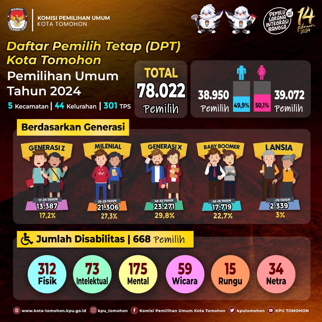 Berikut merupakan Infografis Daftar Pemilih Tetap (DPT) Kota Tomohon Pemilihan Umum Tahun 2024 berdasarkan Jenis Kelamin, Generasi dan Disabilitas yang tersebar di 5 Kecamatan, 44 Kelurahan dan 301 TPS.