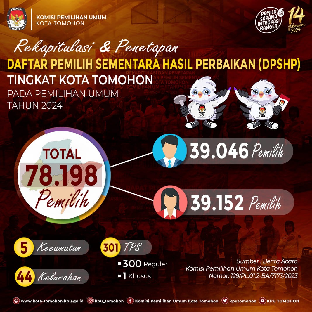 Berikut merupakan Infografis Rekapitulasi dan Penetapan Daftar Pemilih Sementara Hasil Perbaikan (DPSHP) tingkat Kota Tomohon Pemilihan Umum Tahun 2024