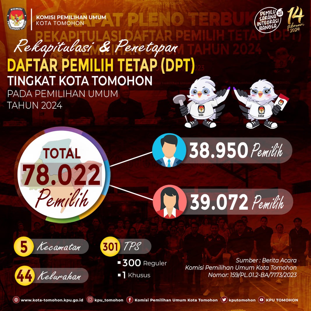 Berikut merupakan Infografis Rekapitulasi dan Penetapan Daftar Pemilih Tetap (DPT) tingkat Kota Tomohon Pemilihan Umum Tahun 2024.