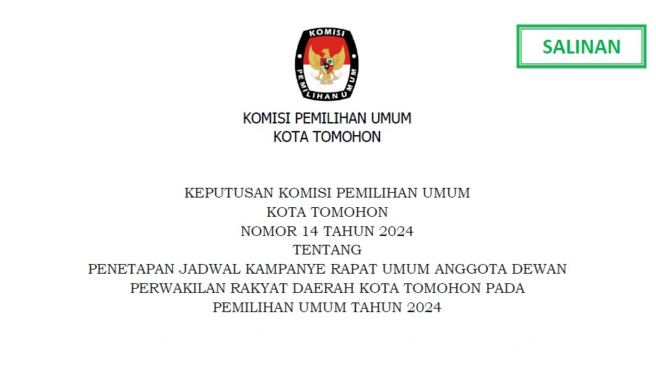 Keputusan Komisi Pemilihan Umum Kota Tomohon Nomor 14 Tahun 2024 tentang Penetapan Jadwal Kampanye Rapat Umum Anggota DPRD Kota Tomohon pada Pemilihan Umum Tahun 2024 Jumat, 19 Januari 2024 22:00 241 SK Nomor 14 Tahun 2024 download Bagikan: Dilihat 241 Kali.