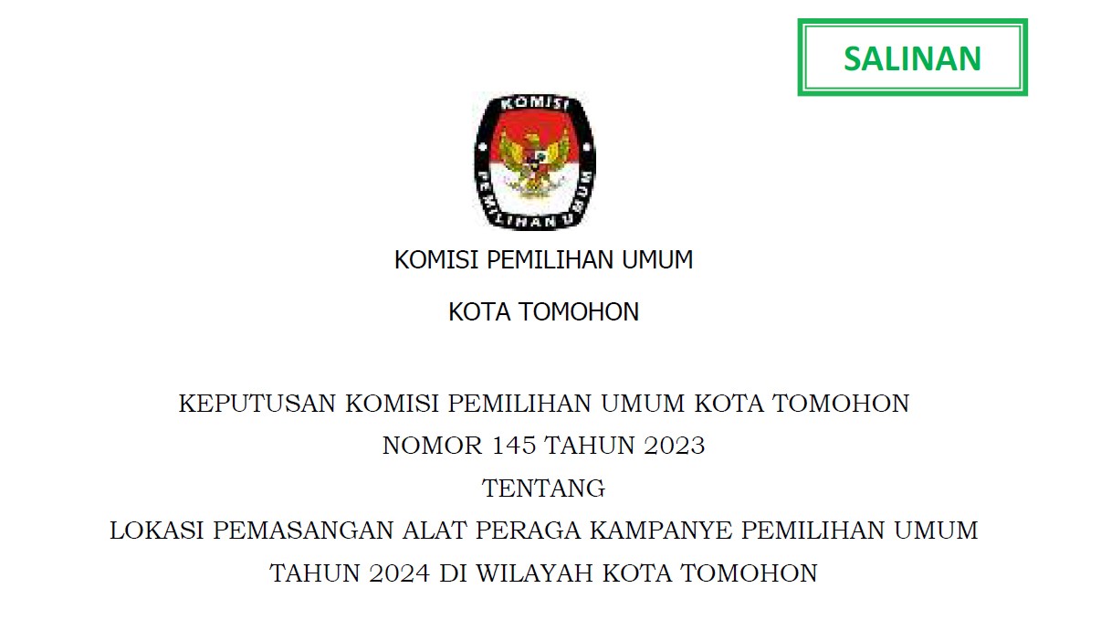 Keputusan Komisi Pemilihan Umum Kota Tomohon Nomor 145 Tahun 2023 tentang Lokasi Pemasangan Alat Peraga Kampanye Pemilihan Umum Tahun 2024 di Wilayah Kota Tomohon Selasa, 28 November 2023 00:01 98 SK Nomor 145 Tahun 2023 download Bagikan: Dilihat 98 Kali.